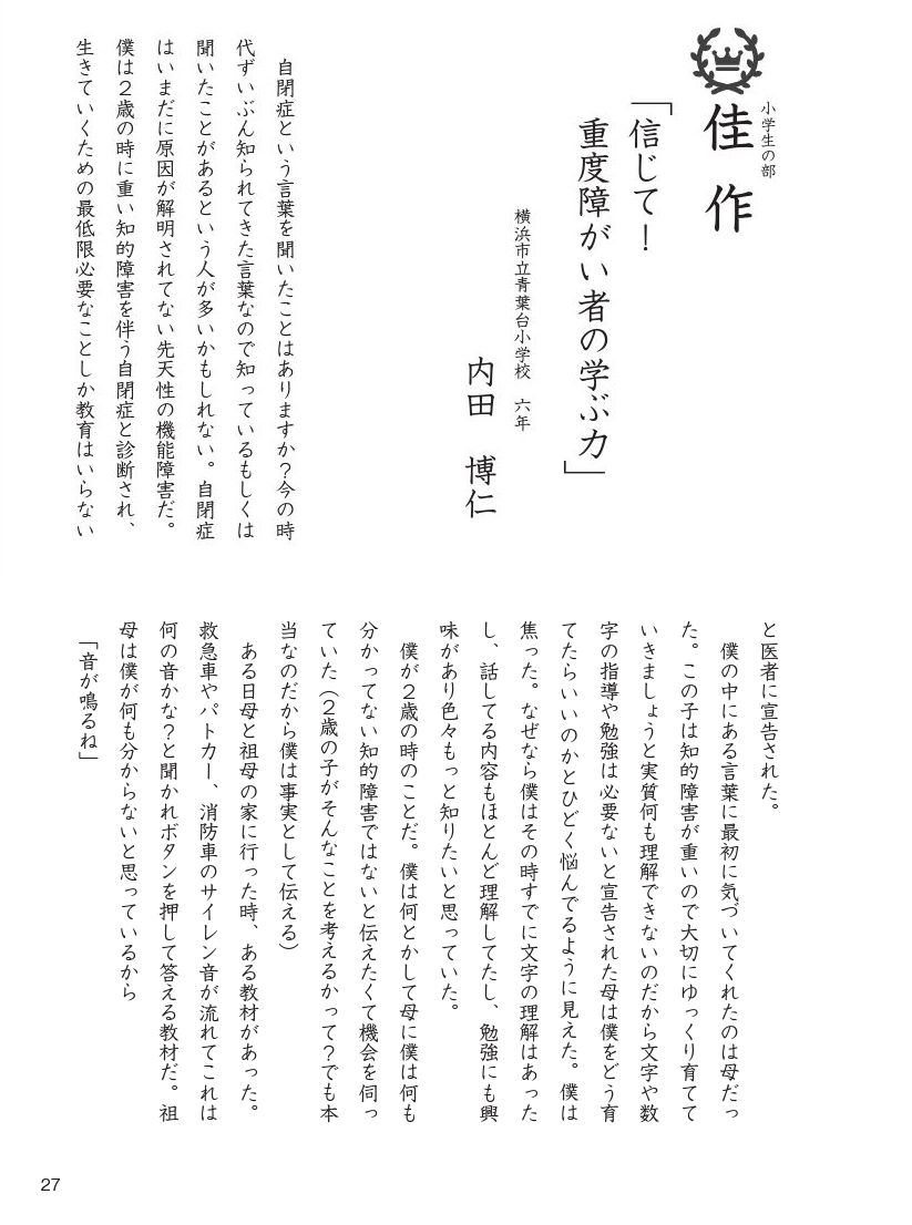 文中「打つ」とあるので、ITの助けを得ての作文だと思いますが、母親の愛情、先生方への感謝、そして読み手に(無知な私だけかもしれませんが)いくつかの「目からうろこ」の新しい発見を提供してくれる文章です。
