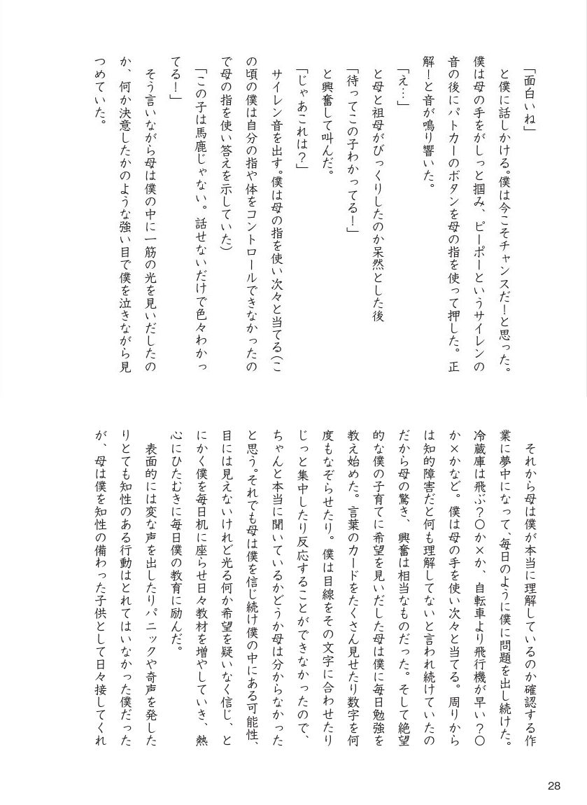 表面的には変な声を出したりパニックや奇声を発したりとても知性のある行動はとれてはいなかった僕だったが、母は僕を知性の備わった子供として日々接してくれた。