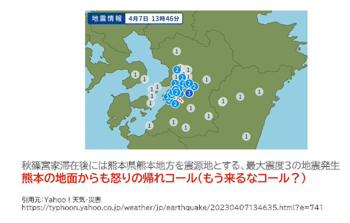 アキシノの行くところ、ろくなことはない、というのが、皇室ウォッチャーの間で言われているけれども、アキシノ一家が九州入りしたのが4月4日。
