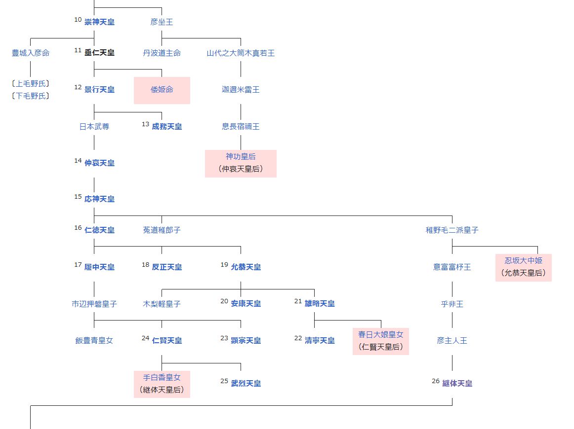 武烈天皇までの「いるかわからん」天皇とは違って、「ハッキリいた」人で、天皇の娘である手白香皇女を奥様にしたのですが、この継体天皇自身、「垂仁天皇から女系で繋がっている」お方なんですね。
