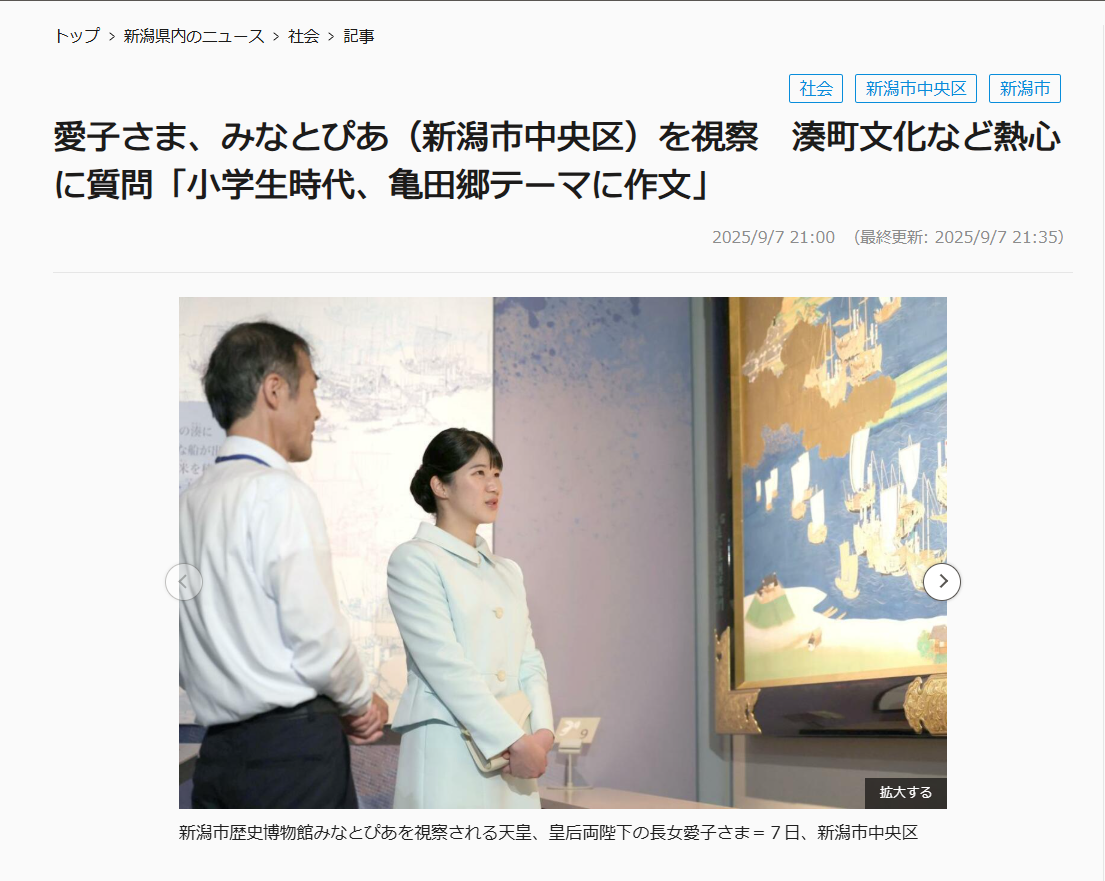 天皇、皇后両陛下の長女愛子さまは7日、新潟市中央区の新潟市歴史博物館みなとぴあを視察された。館長らの説明を聞きながら展示を眺め、新潟の歴史や文化に触れた。