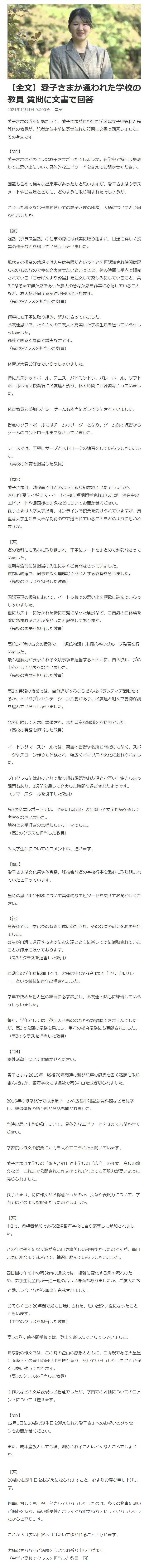愛子さまの成年にあたって、愛子さまが通われた学習院女子中等科と高等科の教員が、記者から事前に寄せられた質問に文書で回答しました。その全文です。