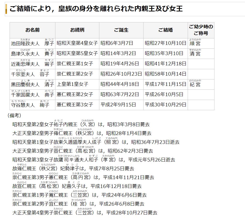 薨去された方をズラズラ書いてごまかしている宮内庁ホムペ。 タイトルが「ご結婚により,皇族の身分を離れられた内親王及び女王」なんだから、(備考)の内容なんて的外れじゃん。 腐っておるわい。 https://www.kunaicho.go.jp/about/kosei/motokozoku.html さっさとマコの名前を書いて、戻って来れないように引導を渡せ。