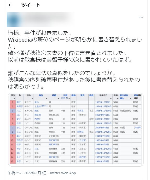 必死なんですねぇ、アキシノ一家、特にどんな手を使っても天皇の座に座りたいアキシノ夫婦に忖度して、何にも知らない人たちに「愛子よりω持ちの秋家の方がえらいんだよ」とすりこむためにやったことでしょうが、ホントに必死というか手段を選ばないというか、ミスリードするためにはどんなことでもやるんですね。